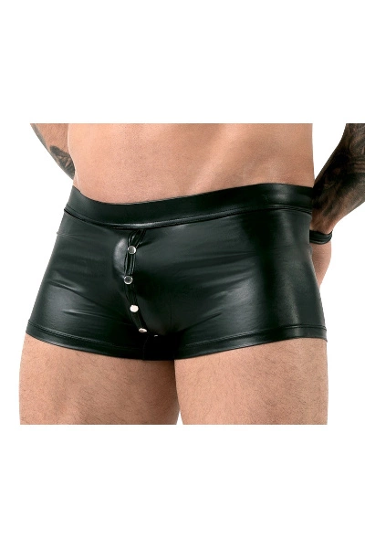 Zwart broekje van Svenjoyment Bondage gemaakt van mooie matte look. Nauwsluitend maar rekbaar, wat betekent dat ze extreem comfortabel zijn om te dragen. Met een rij drukknopen aan de voorkant die over het kruis gaat en stopt bij de bovenkant van de billen. Er zijn twee meegeleverde handboeien bevestigd aan de tailleband aan de achterkant. De handboeien houden de handen aan de achterkant vast. De handboeien met matte look hebben klittenbandsluitingen.