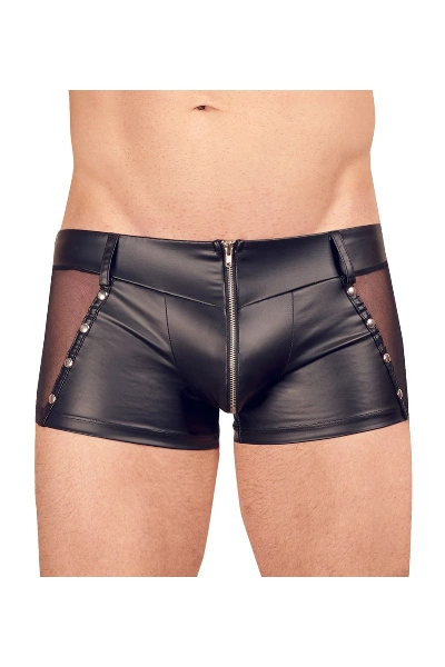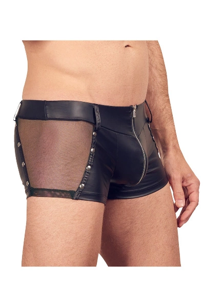 Figuurlijk flatterende broek van Svenjoyment van trendy mat-look materiaal met transparante netinzet en decoratieve studs aan weerszijden. Met riemlussen en een gewatteerde ritssluiting aan de voorkant.