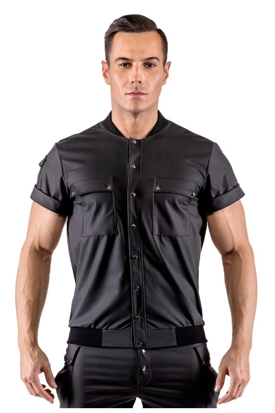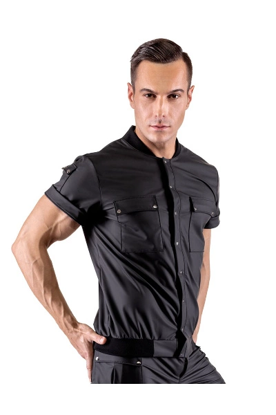 Zwart, ruimvallend overhemd van Svenjoyment, gemaakt van lichtgewicht stretchmateriaal met een trendy matte afwerking. In blousonstijl met drukknoopsluiting over de hele lengte aan de voorkant, en de typische gebreide inzetstukken in de kraag en de tailleband. 2 opgestikte borstzakken aan de voorkant en een klein zakje op de mouw – alle zakken met drukknoopkleppen.