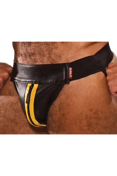 Deze eyecatching COLT lederen zip-jock is gemaakt van het fijnste leer met opvallende gele dubbele streepdetails, ritssluiting aan de voorkant en zwarte elastische tailleband.