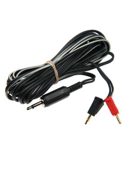 4 meter lang met een 3,5 mm jack-aansluiting aan het ene uiteinde en twee kleurgecodeerde vergulde 2 mm pluggen aan het andere uiteinde.