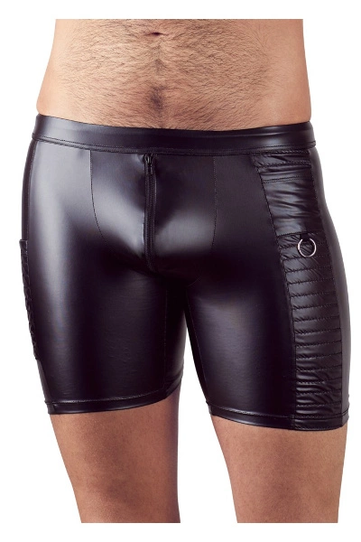 Het strakke, matte materiaal geeft de man een extreem hete achterkant, terwijl de gewatteerde ritssluiting aan de voorkant ervoor zorgt dat hete actie in een flits kan gebeuren. Het praktische zakje aan de zijkant is gestikt en maakt het mogelijk om ook als de man halfnaakt is spullen te verbergen. Voorbereiding is alles!
