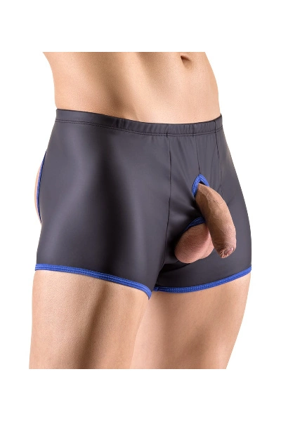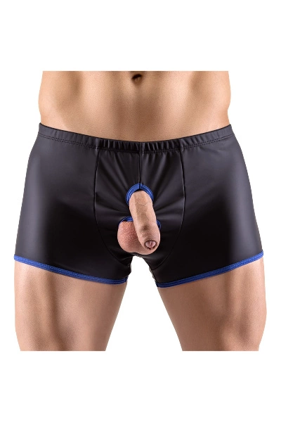 Een pofbroek van Svenjoyment met showmaster openingen voor penis en testikels. In trendy matzwarte look met contrasterende, zorgvuldig omboorde uitsnijdingen en beenmanchetten in koningsblauw. De elastische kwaliteit sluit goed aan op de huid en is uiterst comfortabel om te dragen. De provocerende openingen zijn niet alleen decoratief, maar zorgen ook voor een bijzonder opwindende draagervaring.