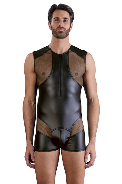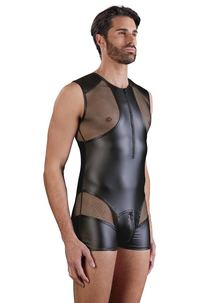 Elastische jumpsuit in matte look met net-inzetstukken aan de voor- en achterkant. De ritssluiting aan de voorkant en de tweede ritssluiting over de buidel maken dit sexy ontwerp nog erotisch.