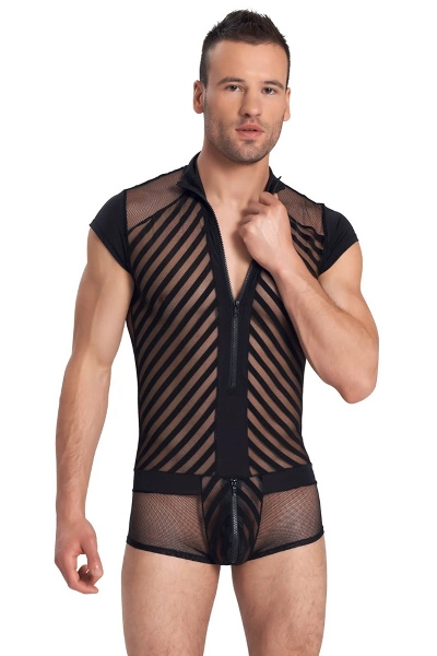 Deze playsuit met korte mouwen zet je in de schijnwerpers! De twee soorten netten en het ontwerp met warme strepen laten een brutale blik toe. Ritssluiting aan de voorkant en een gewatteerde ritssluiting op de buidel. Zwart. 90% polyamide, 10% elastaan.