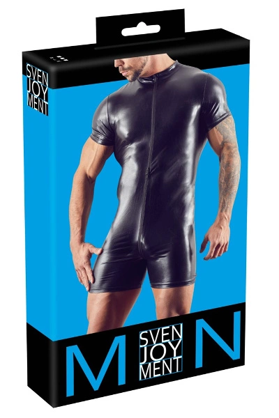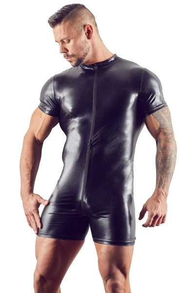 Nauwsluitende maar rekbare playsuit gemaakt van een glanzende wetlook. Met een kleine opstaande kraag en een ritssluiting aan de voorkant die over het kruis gaat en stopt bij de billen. Zwart. 92% polyester, 8% elastaan.