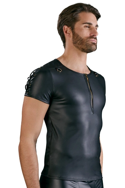 Recht gesneden overhemd in een delicate, zwarte matte look met een korte messing ritssluiting aan de voorkant. Met D-ringen op de schouders en opvallende vetersluiting op de mouwen. Heerlijk rekbaar voor een perfecte pasvorm.