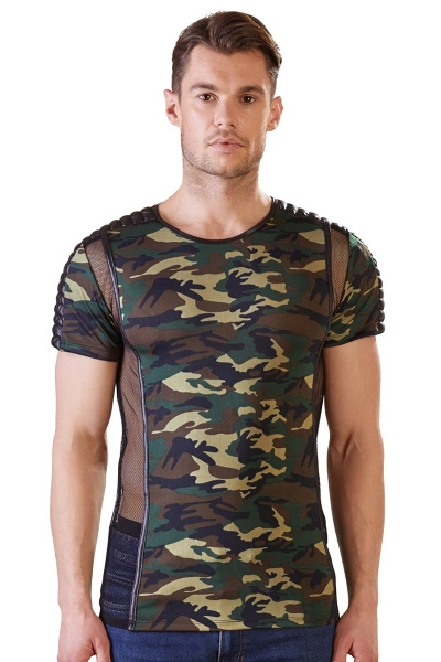 Een zacht microvezel overhemd in een camouflage-design met inzetstukken van net aan beide kanten. Op de schouders en de mouwen zitten stukken mooi zwart mat materiaal gestikt. Microvezel 95% polyester, 5% spandex; inzetstukken van 90% polyamide, 10% spandex.