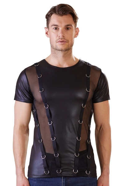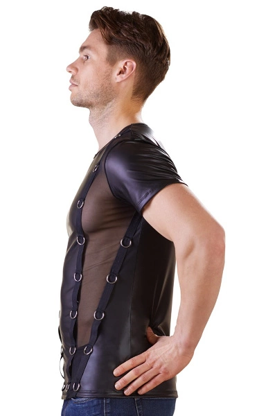 Een zwart overhemd gemaakt van rekbaar materiaal mooi mat materiaal en powernet. Aan de voorkant zitten metalen ringen aan de gestikte, met stof beklede banden. Matte look 90% polyester, 10% spandex; powernet 90% polyamide, 10% elastaan.
