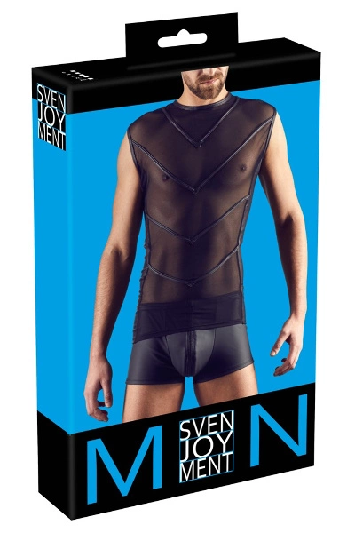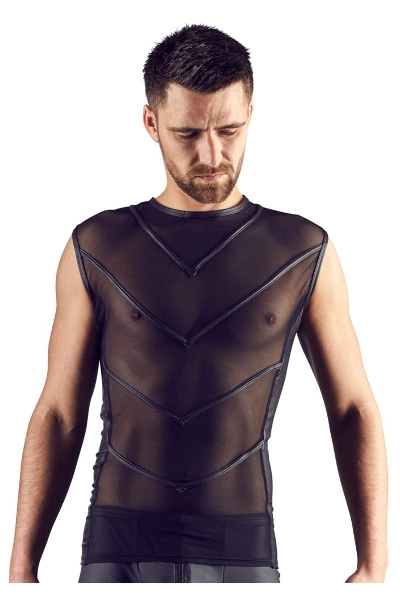 Dit zwarte shirt met een fijne matte glans gemaakt van dun, elastisch materiaal prikkelt met powernet-inzet en slank gestikte strepen aan de voorkant. De smalle hals maakt de extravagante look perfect af. Je ziet er altijd geweldig uit in deze figuuraccentuerende top – zelfs de grotere heren!