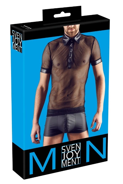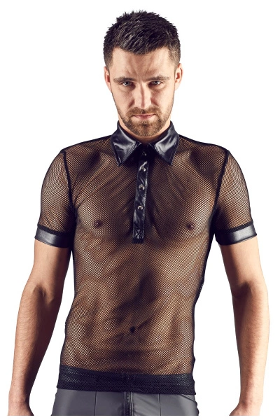 Pronk met dit mannelijke poloshirt met drukknopen die op de borst stoppen en vrouwen zullen zich aan je voeten werpen. Het shirt is ook gemaakt van een verleidelijke mix van net en wetlook. Zwart. 100% Polyester.