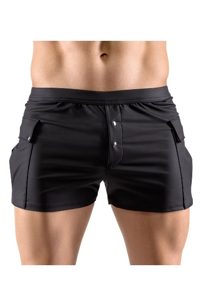 Zwarte, ruimvallende short van Svenjoyment, gemaakt van lichtgewicht stretchmateriaal met trendy matte afwerking. Arbeidersmodel met drukknoopsluiting, 2 grote zakken aan de zijkanten en 2 opgestikte zakken aan de onderkant – alle zakken met drukknoopsluiting.