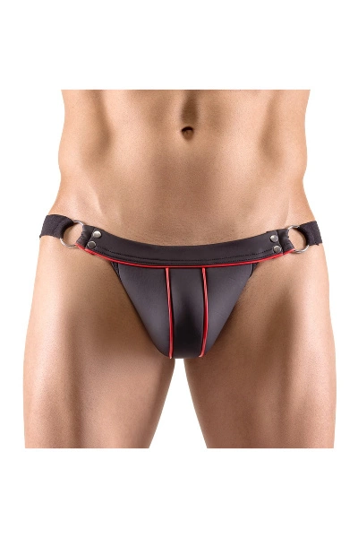 Snit & Materiaal: Butt-free jockstrap in een trendy zwarte matte look die doet denken aan neopreen. Biesjes vooraan in contrasterend rood.Brede elastische geweven bandjes op de rug. 90% polyester, 10% elastaan, polyurethaancoating.