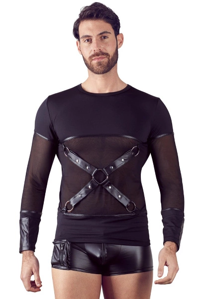 Shirt in matte look met lange mouwen en een stijlvol powernet-inzetstuk aan de voorkant om de spieren van een man te laten zien. Het afneembare borstharnas (drukknopen) heeft mooie en exclusieve details voor de toeschouwer en is bovendien verleidelijk, uitnodigend en wekt de eetlust van de partner op.