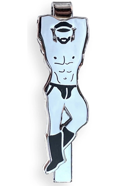 Hard geëmailleerde afbeelding in mat zwart en zilver (zinklegering) op een dasspeld.
