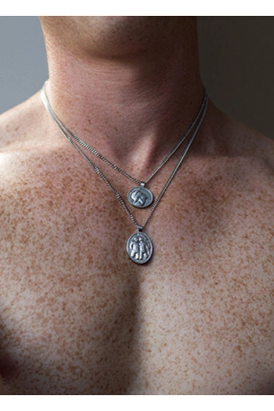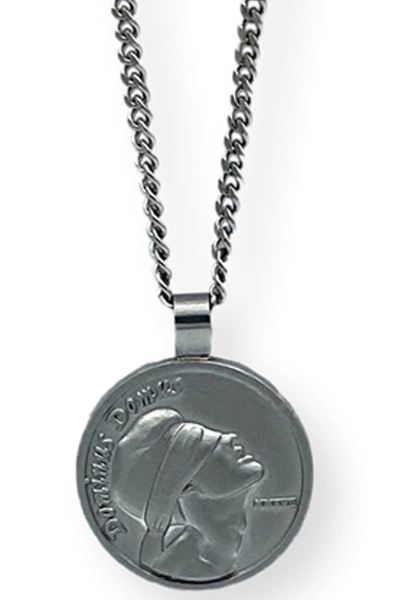 Een hanger geïnspireerd op Romeinse munten, met een geblinddoekte man die vol verwachting wacht om zich volledig over te geven.