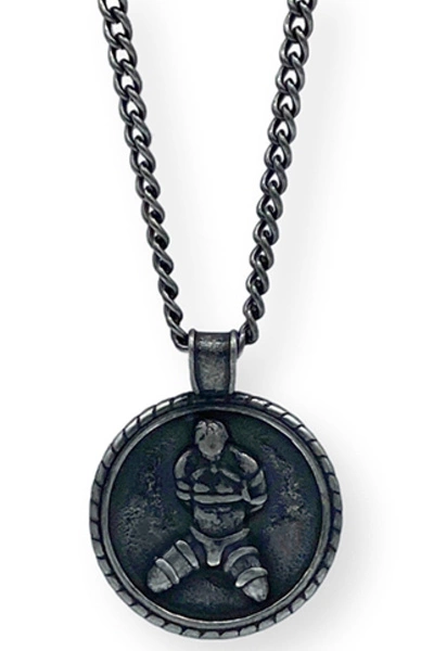 Een hanger geïnspireerd op Romeinse munten, met een sexy afbeelding om je waardering voor de kunst van bondage te tonen.