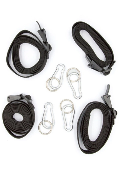 De set bestaat uit 4 karabijnhaken, 4 ijzeren ringen (gelast) & 4 x 150 cm webbing.