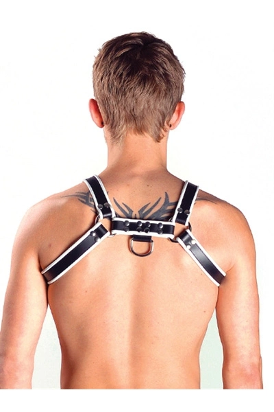 Alle straps zijn gevoerd met zacht gekleurd leer; deze afwerking in kleur geeft dit harnas zijn moderne en kinky look. Verstelbaar met gespen.