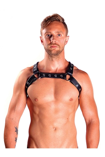 De voorkant heeft 2 d-ringen waar het harnas met elkaar verbonden wordt en het leer is afgewerkt met studs nagels als versieren voor een echte kinky look.