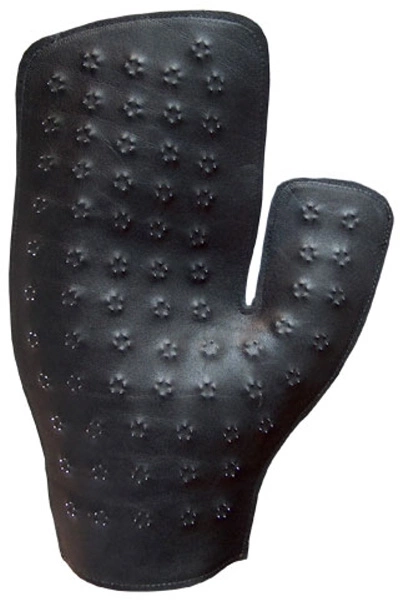 Recht handige leren handschoen met nagels die overtrokken zijn met een extra laag leer…
