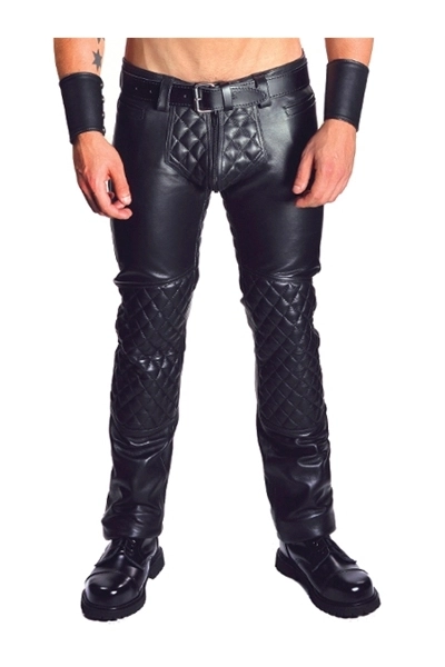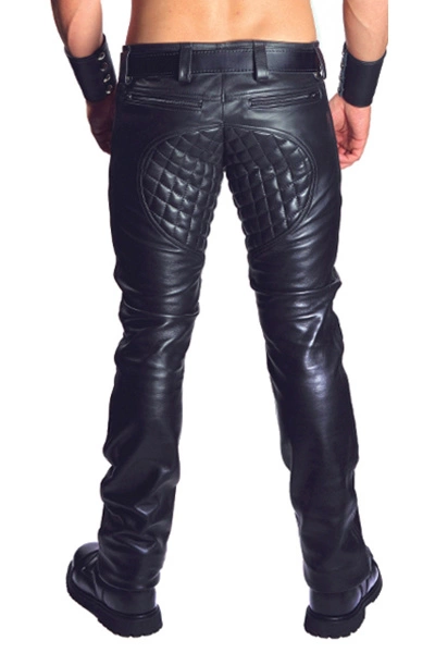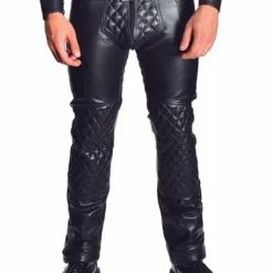 Het belangrijkste kenmerk van deze lederen jeans zijn de gewatteerde en gestikte lapjes op de knieën, het kabeljauwstuk (kruis) en het kontzadel.