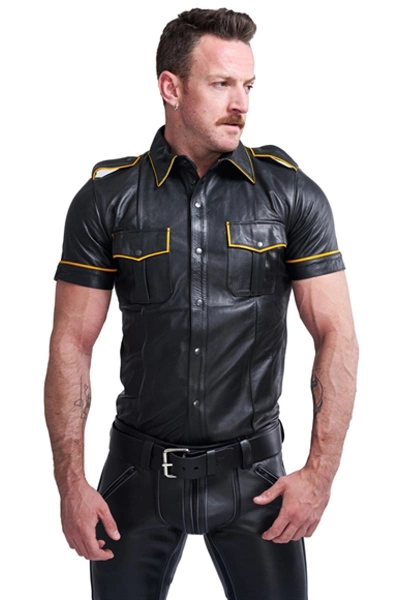 De Mister B Leather Police Shirts hebben korte mouwen, epauletten en twee borstzakken. die allemaal zijn bekleed met gele biezen. Verkrijgbaar in de maten XS-XXXL (opmerking: vallen strak).