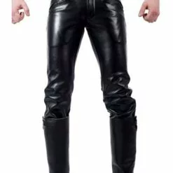 Mister B Leather Ranger Jeans is een prachtige zwarte leren jeans met twee witte strepen aan de zijkant.