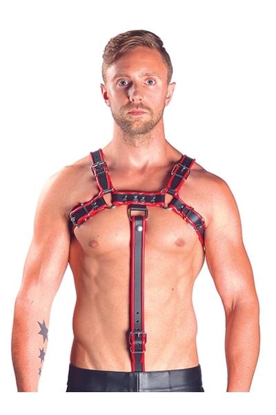 100% echt zadelleer. De banden zijn opzij gezet met zachter leer in verschillende kleuren, passend bij het divers borstharnassen. De meegeleverde cockring heeft een diameter van 55 mm