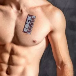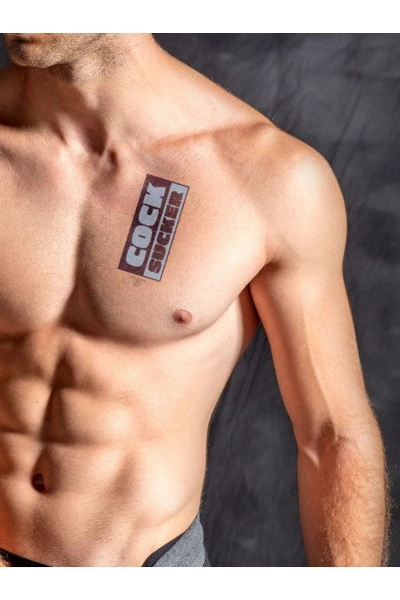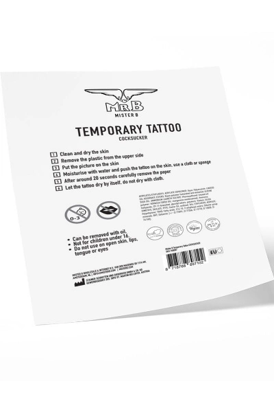 De tijdelijke tattoo! Wees een trotse cocksucker met de Mister B Tijdelijke Tattoo Cock Sucker . Wees een lulzuigend varken als je op het feest bent met de naam op je rug of borst en laat iedereen weten hoeveel je ervan houdt om grote D in je keel te krijgen.