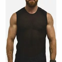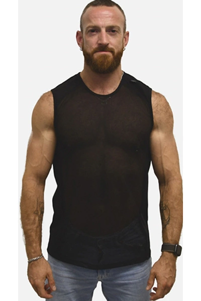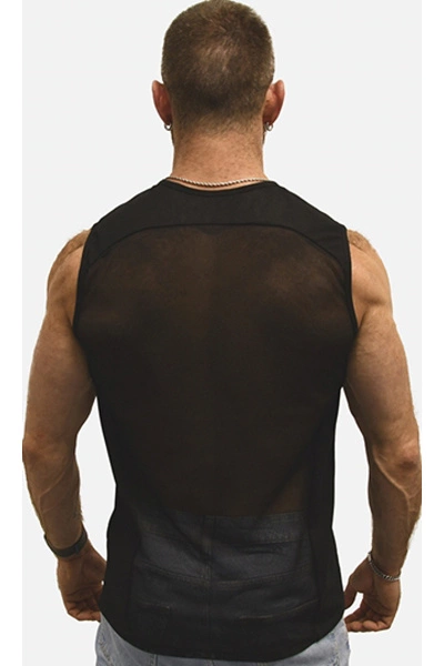 Breng die biceps of tats in de kijker met dit mouwloze shirt, terwijl ons unieke doorschijnende mesh torso-ontwerp een glimp geeft van het hete lichaam eronder.