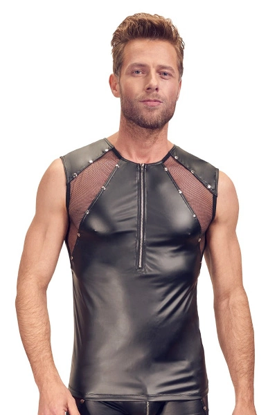 Mouwloos, figuuraccentuerend shirt van Svenjoyment gemaakt van stretchy, zwart, matte look materiaal met netinzet en opvallende stud decoratie. Met ritssluiting aan de voorkant.