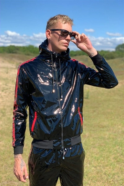 Dit trainingspak is vergelijkbaar met het PVC-trainingspak met de witte strepen, maar nu met, wie kan het zich voorstellen, rode strepen! Bijpassende jas verkrijgbaar!