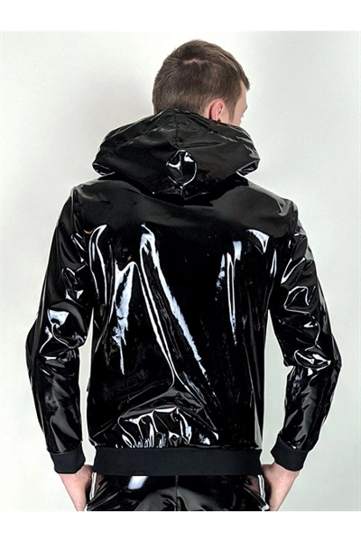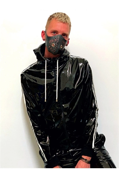 Yesz jongen! Eindelijk een echt trainingsjack gemaakt van PVC. Het is zwart, glanzend en het knettert! Het trainingspak is voorzien van twee witte strepen, de jas heeft een trekkoord in de capuchon en een zwart gestikte MR. logo op de borst.