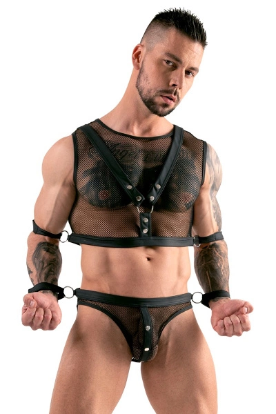 Een crop top en een jock met open rug gemaakt van zacht, rekbaar net met matte look details. Aan de bovenkant is een harnas stevig vastgenaaid. De jock kan worden geopend dankzij de praktische drukknopen op de pouch. Beide delen hebben aan weerszijden een ring zodat de 4 meegeleverde zachte boeien aan de outfit kunnen worden bevestigd. De boeien hebben verstelbare klittenbandsluitingen.